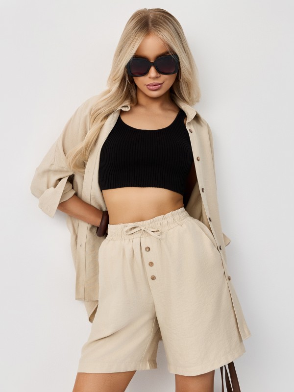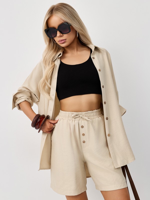 Летний женский костюм с шортами — идеальный выбор для стильного и комфортного образа! Выполнен из легких натуральных тканей: хлопка, льна и вискозы, он обеспечивает прохладу и удобство в жаркие дни. Свободный оверсайз-крой с спущенными плечами, широкими шортиками, карманами и пуговицами добавляет трендовую эстетику, вдохновленную Pinterest. Однотонный дизайн делает костюм универсальным и модным.