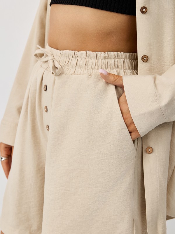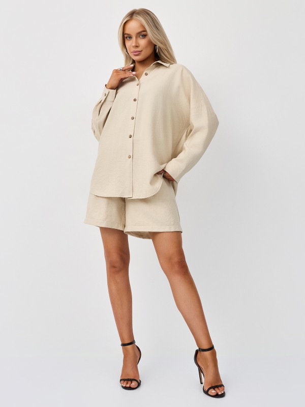 Летний женский костюм с шортами — идеальный выбор для стильного и комфортного образа! Выполнен из легких натуральных тканей: хлопка, льна и вискозы, он обеспечивает прохладу и удобство в жаркие дни. Свободный оверсайз-крой с спущенными плечами, широкими шортиками, карманами и пуговицами добавляет трендовую эстетику, вдохновленную Pinterest. Однотонный дизайн делает костюм универсальным и модным.